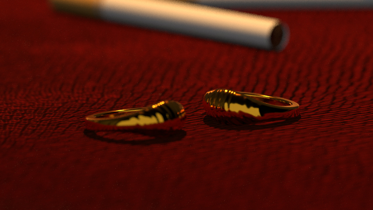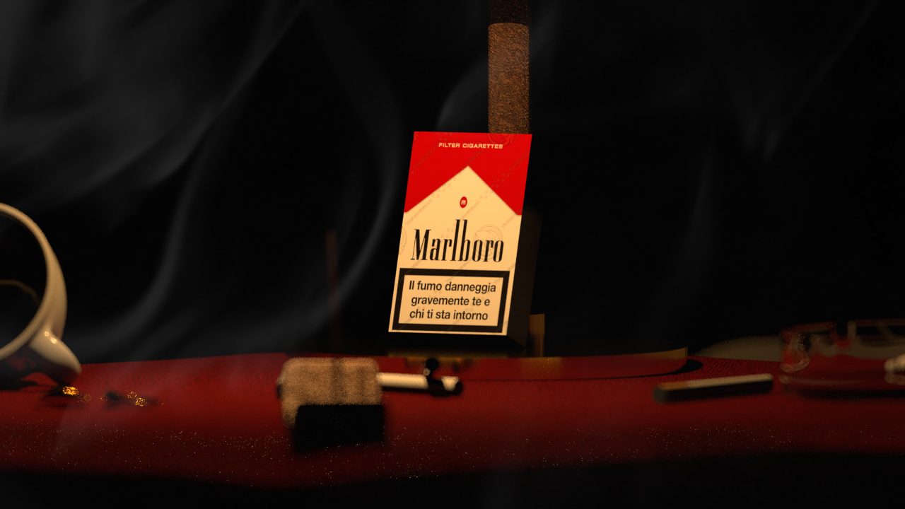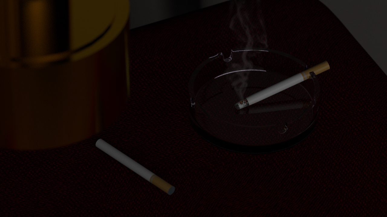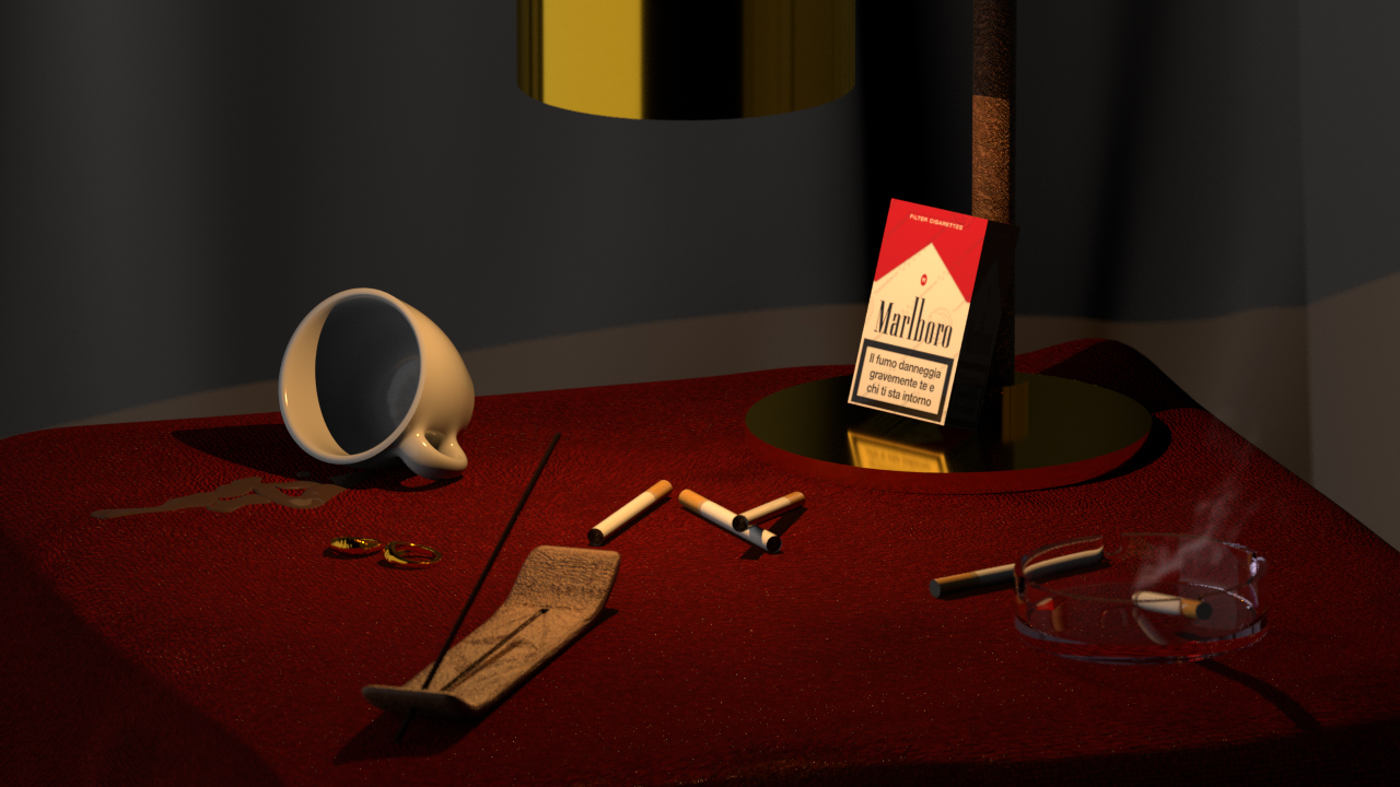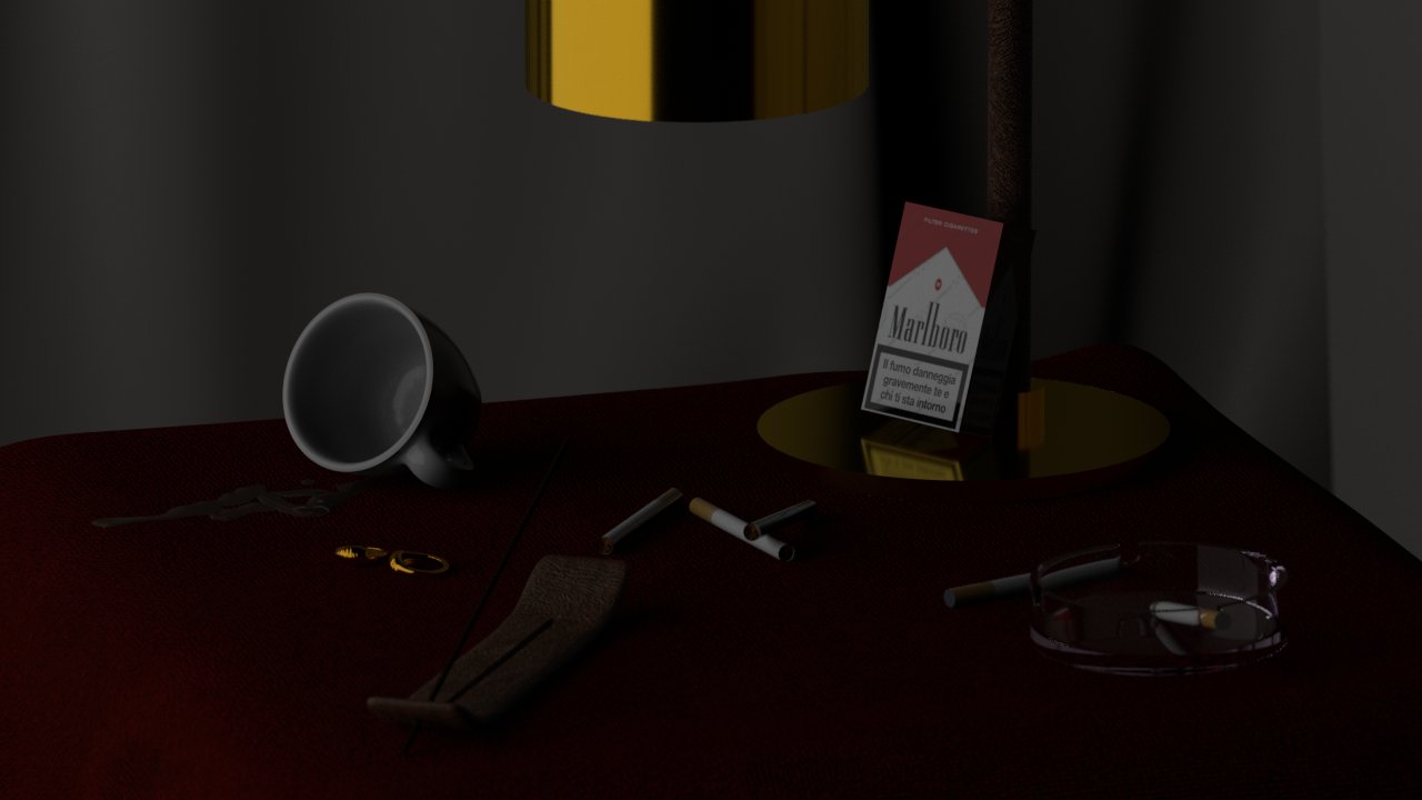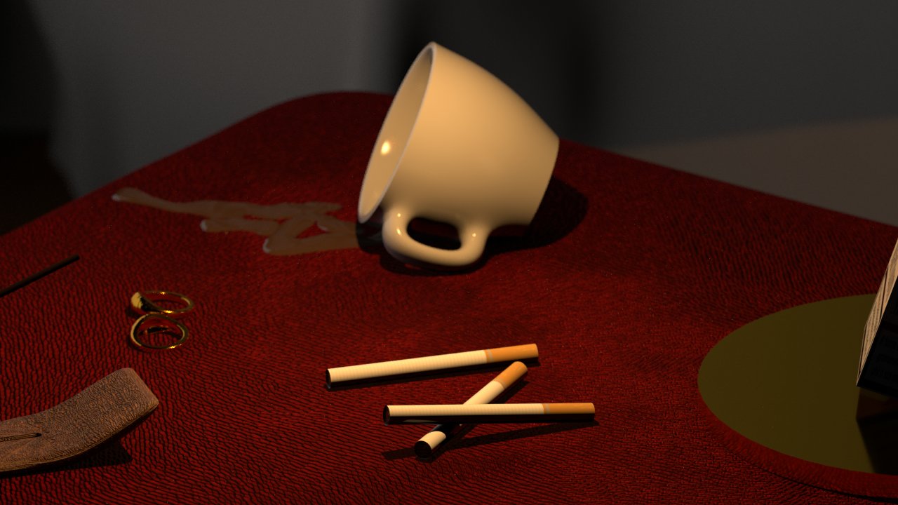 Cada objeto fue modelado con especial atención al detalle. El brillo del oro en contraste con las sombras dramáticas que los rodean añade un sentido de riqueza y nostalgia. La taza volcada, las colillas y el paquete de cigarrillos fueron diseñados para transmitir realismo y peso, creando una escena del día a día.