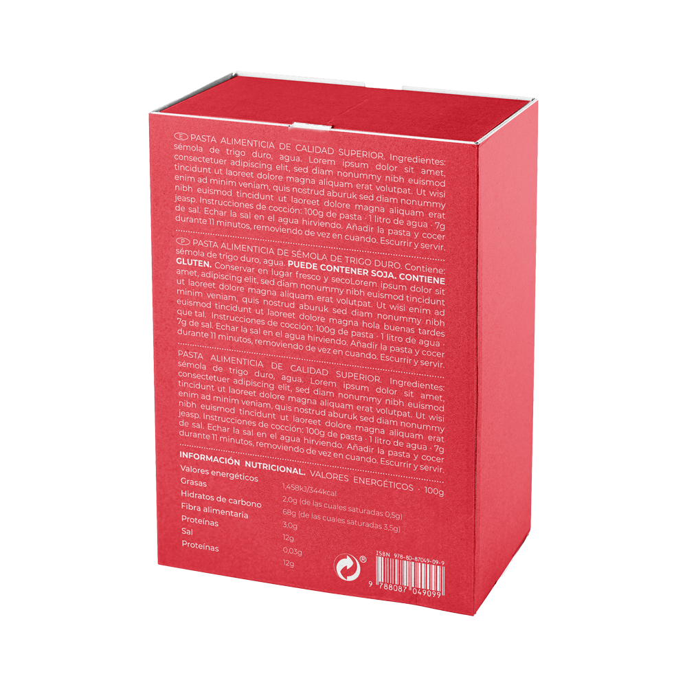 Pasta de sémola de trigo y tomate: Representada con la figura de una botella de vino, este diseño sugiere celebración, brindis y momentos compartidos. La botella, subraya la idea de que cocinar y compartir esta pasta es una forma de festejar juntos.