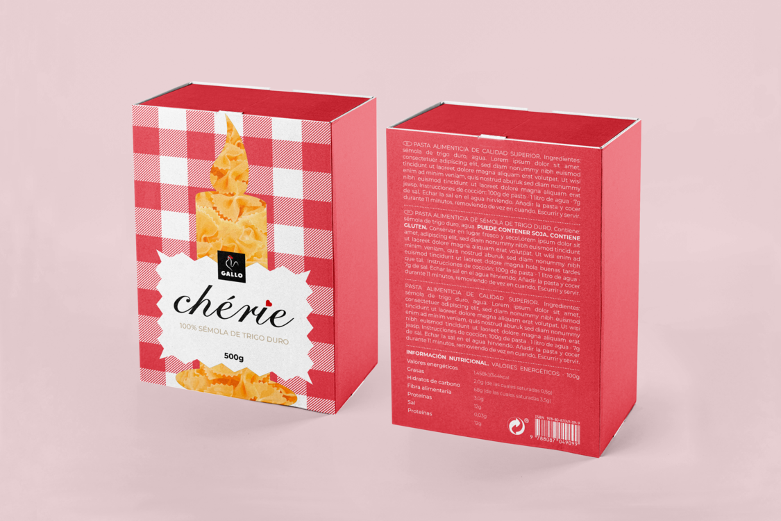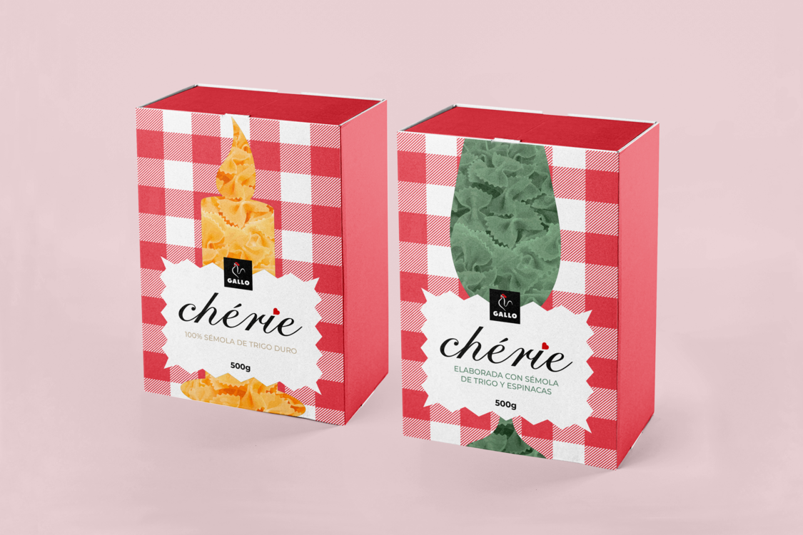 Este diseño de packaging, creado como propuesta para Pastas Gallo, tiene como objetivo transformar un alimento cotidiano en un obsequio especial, ideal para regalar en fechas señaladas. El concepto detrás de la línea “Chérie” es invitar a las personas a compartir momentos significativos a través de la cocina, convirtiendo la preparación de una comida en una experiencia única para disfrutar juntos.